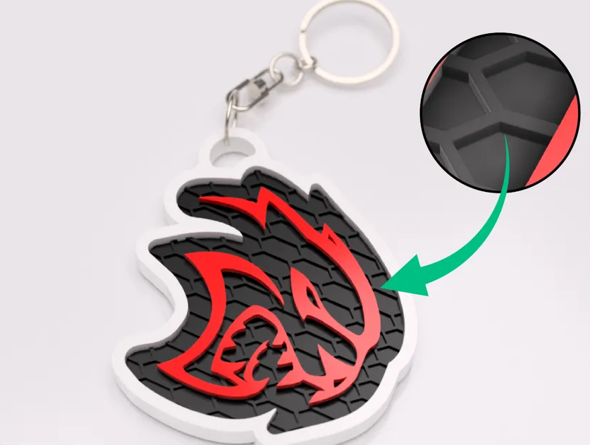 3D designad nyckelring med Dodge hellcat design. Skickas som standard i färgerna som syns på bild.